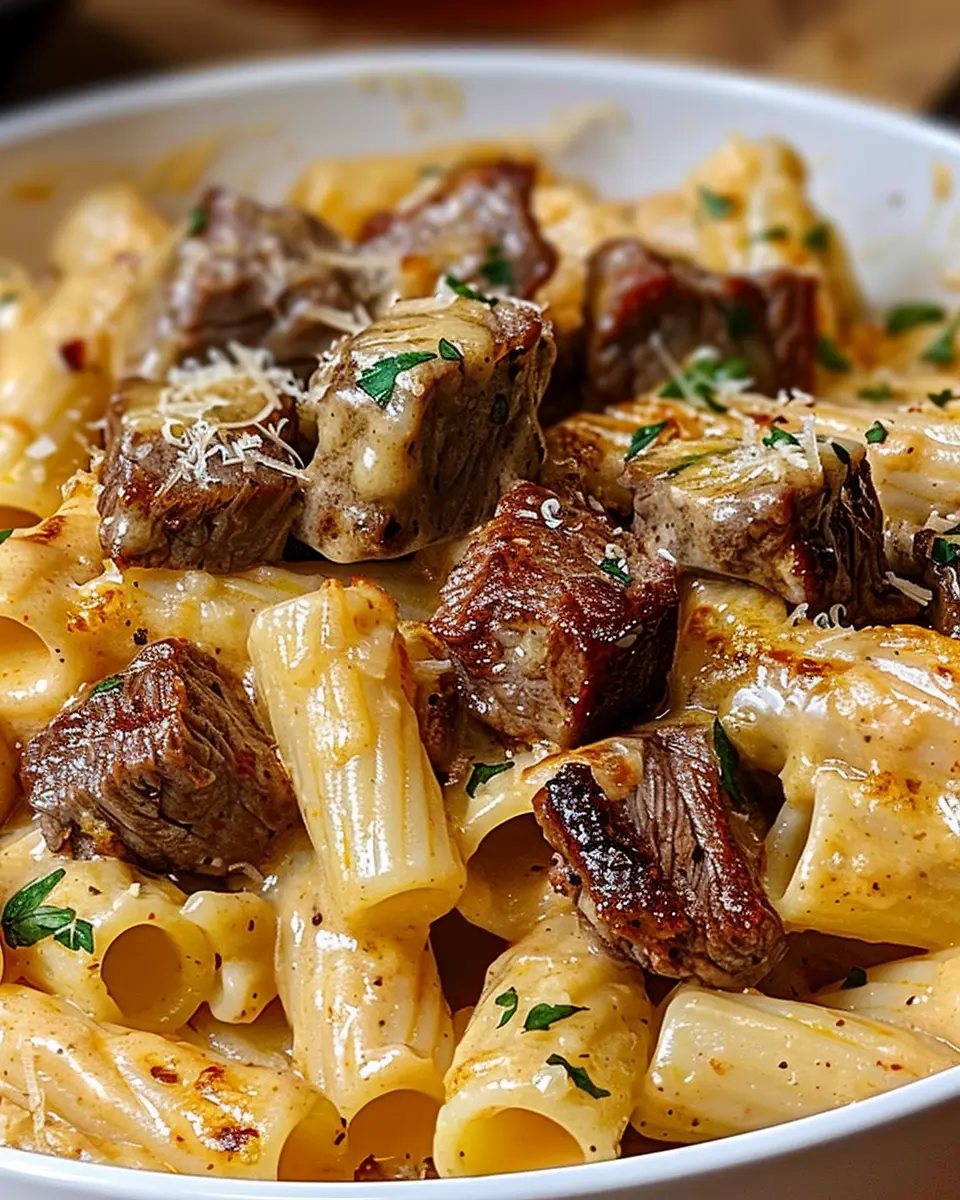 PrintCajun Steak Tips in Indulgent Cheesy Rigatoni Parmesan Sauce