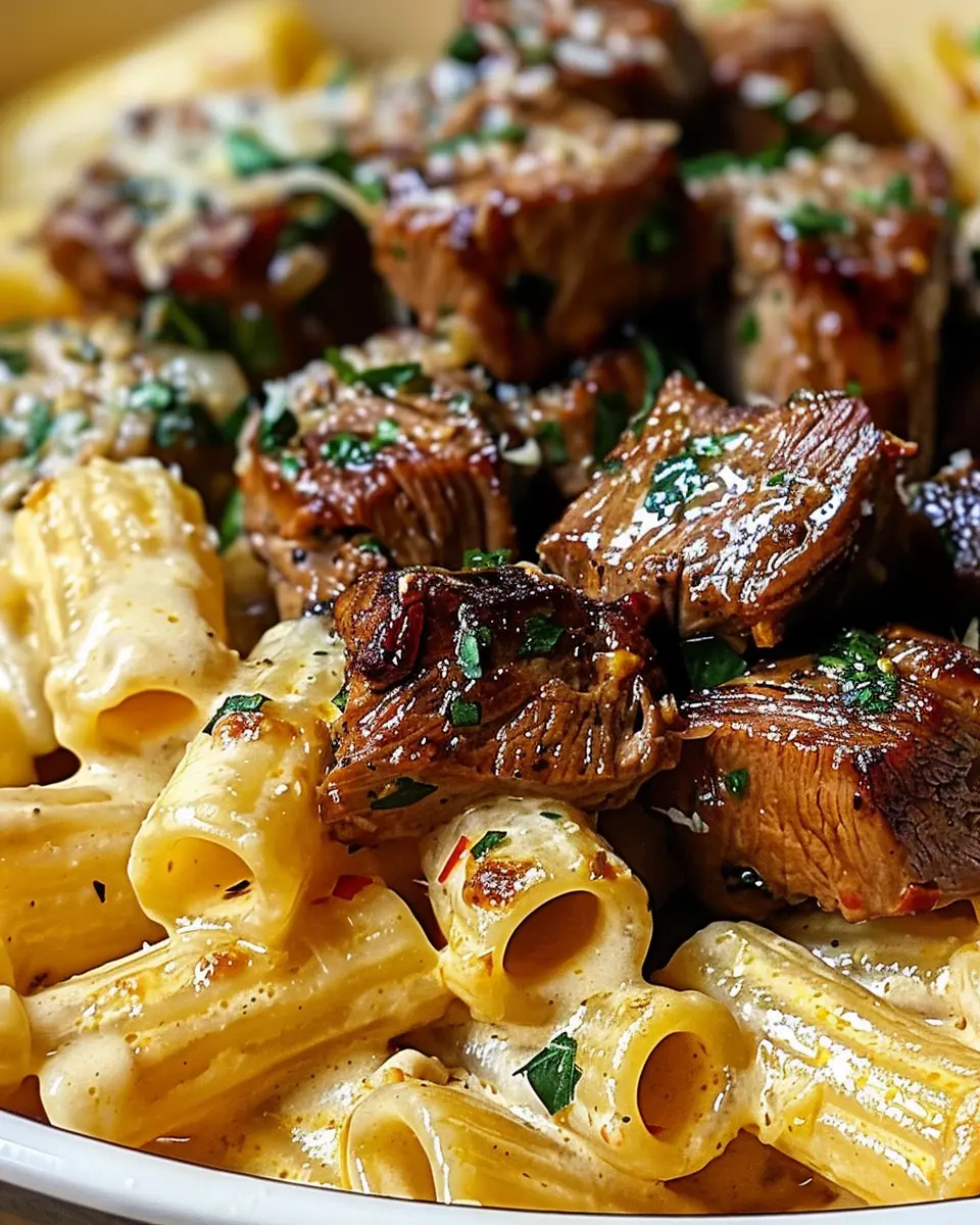 Experience the rich flavors of Cajun steak tips paired with cheesy rigatoni in this indulgent dish that’s perfect for any occasion.