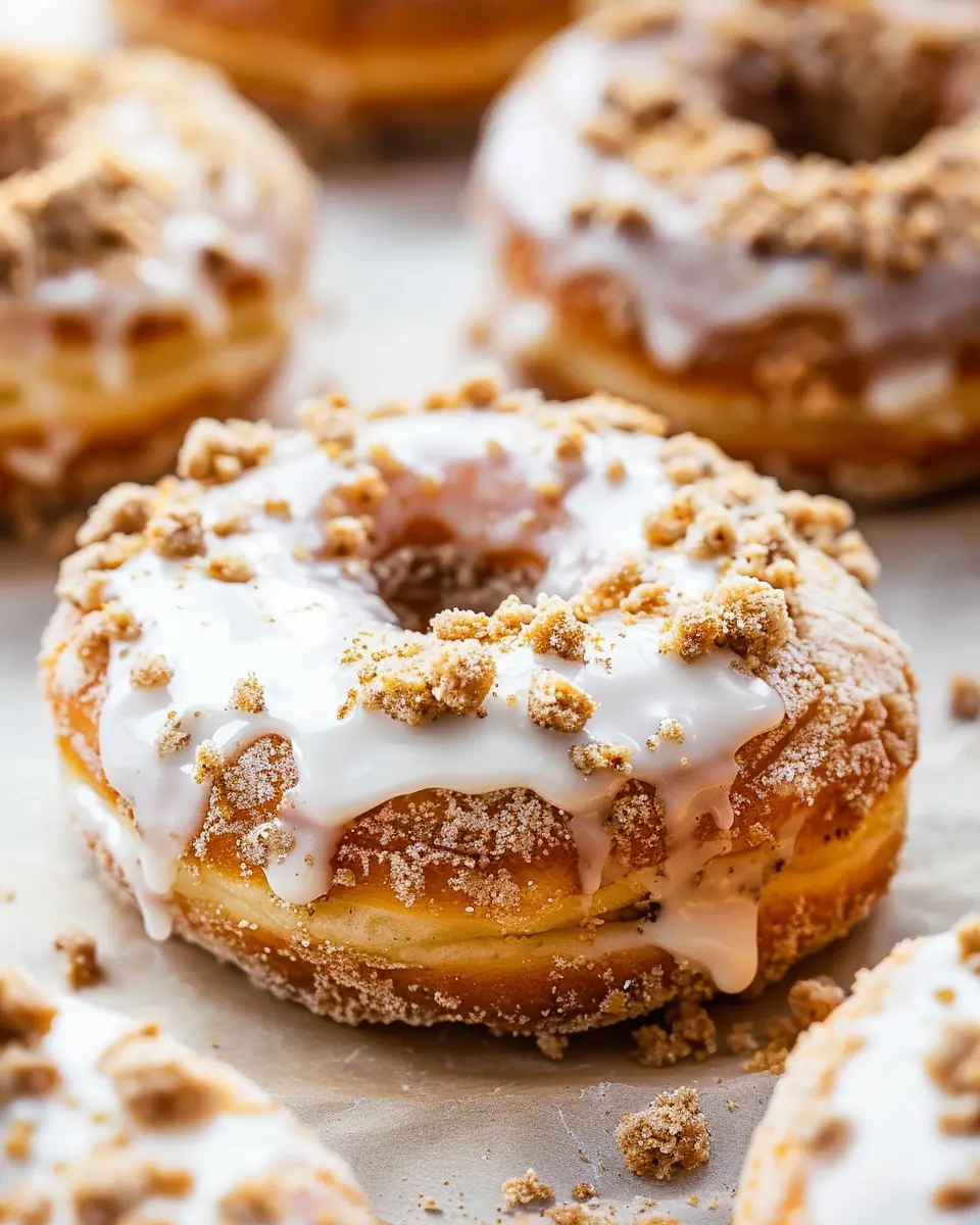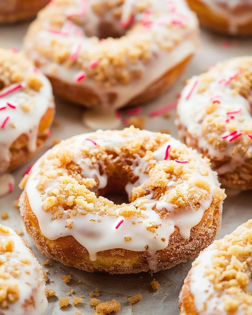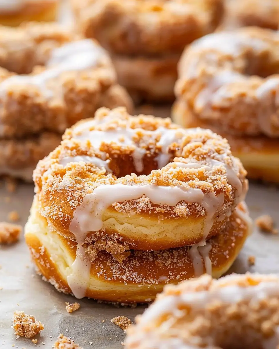 Dip each cooled donut into the glaze, allowing any excess to drip off. For an extra touch, while the glaze is still wet, you can sprinkle some of that delicious crumb topping over the donuts. This finishing touch creates beautiful, Instagram-worthy treats!