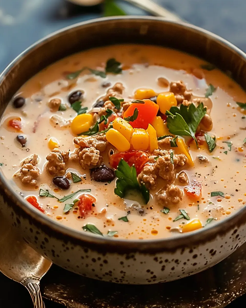 A warm and hearty soup made with turkey bacon and creamy goodness, perfect for a comforting meal.