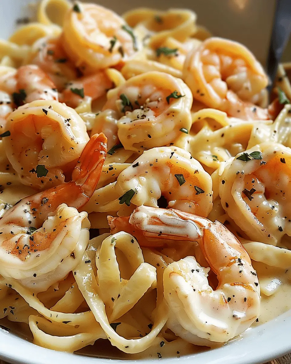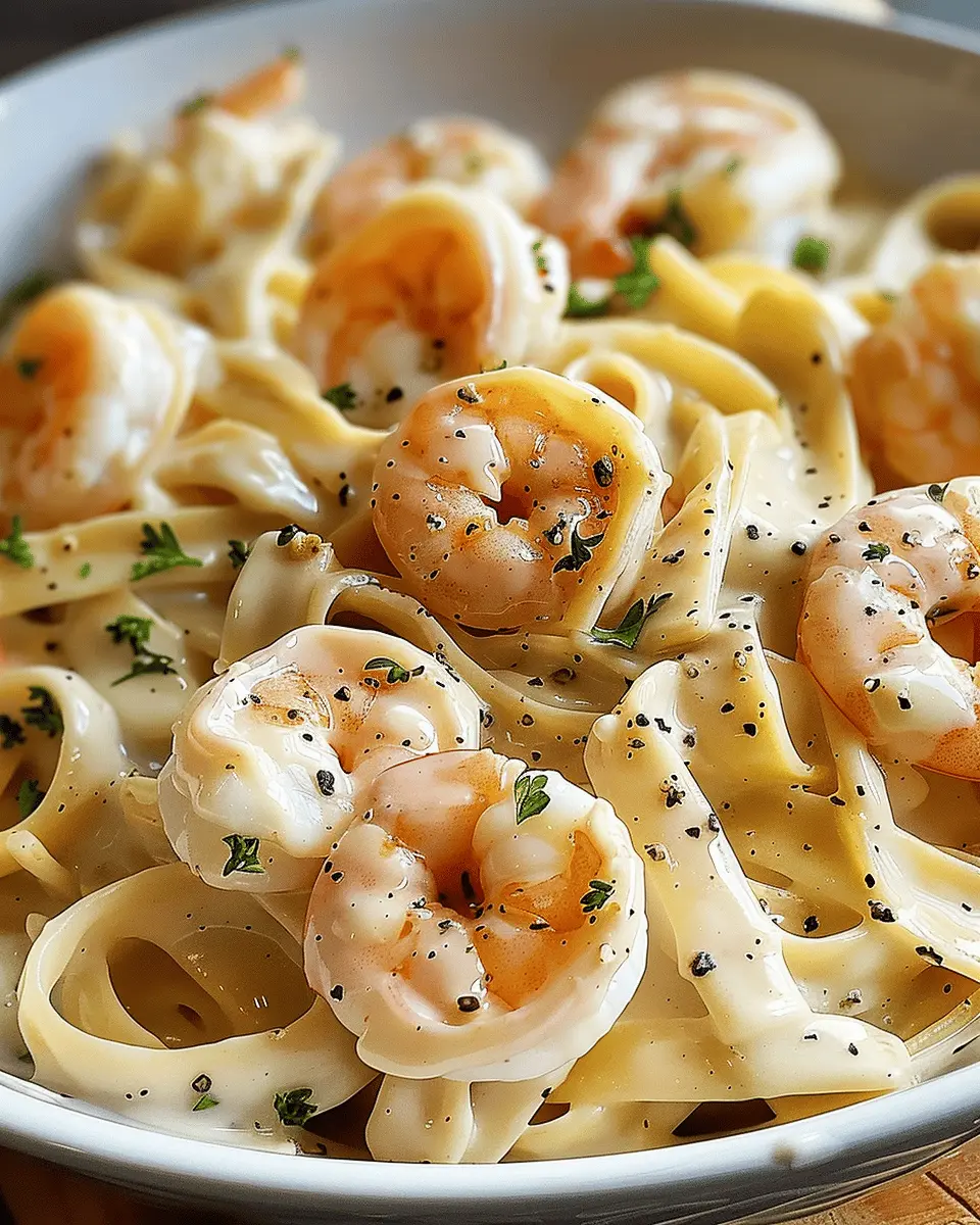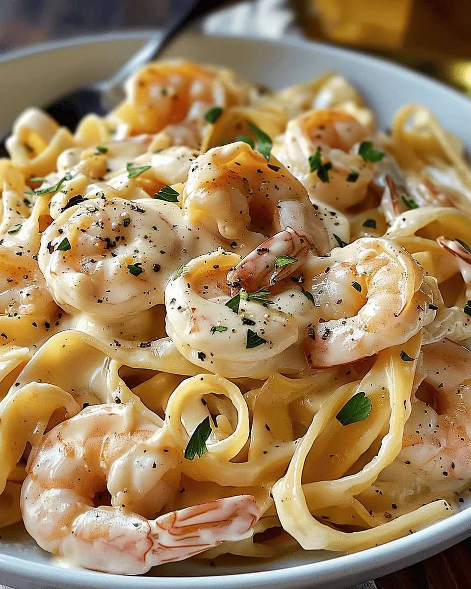A rich and creamy dish that combines tender shrimp with fettuccine pasta, all tossed in a luscious homemade Alfredo sauce.