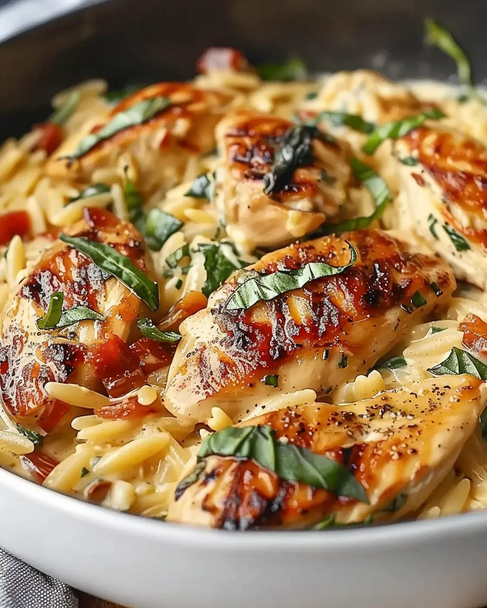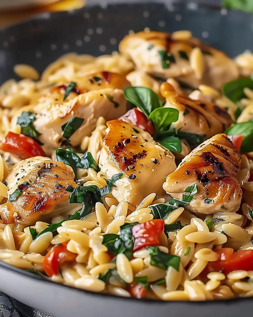 A rich and creamy dish featuring tender orzo pasta, succulent chicken, and vibrant Tuscan flavors.