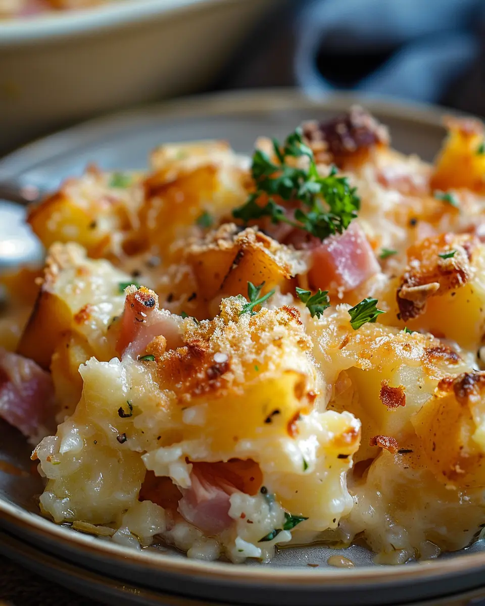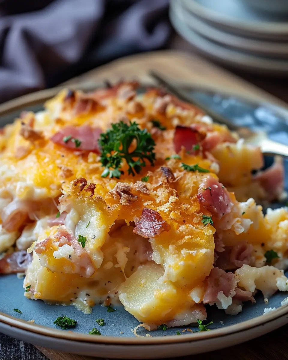 A delicious and hearty casserole made with ham, potatoes, and turkey bacon, perfect for any family meal.