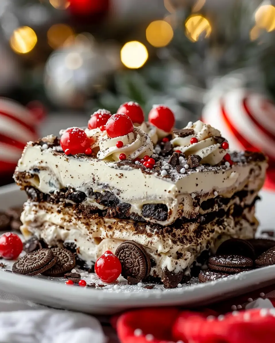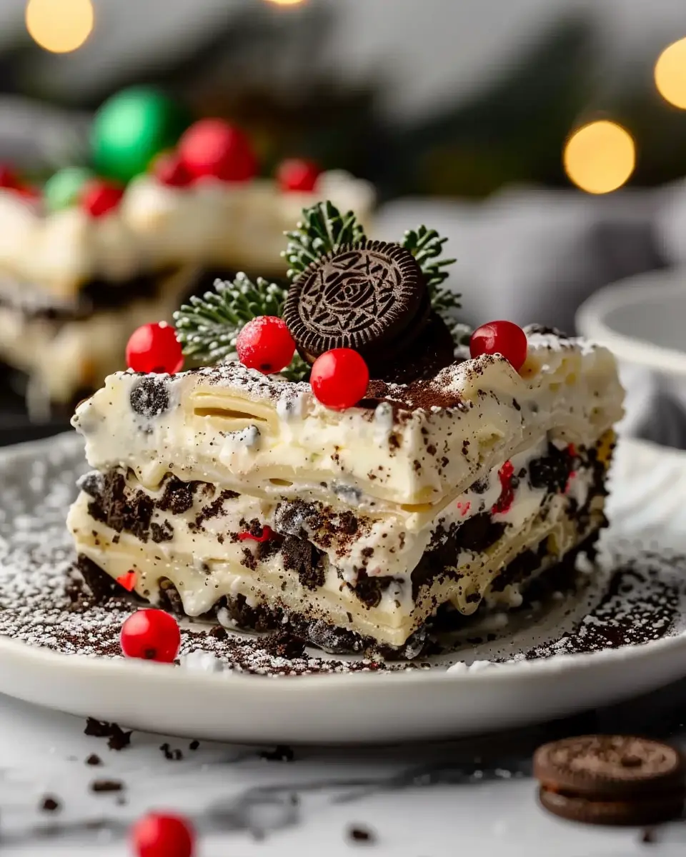 Keywords: No-Bake Christmas Oreo Lasagna, festive dessert, chocolate pudding, Oreo lasagna