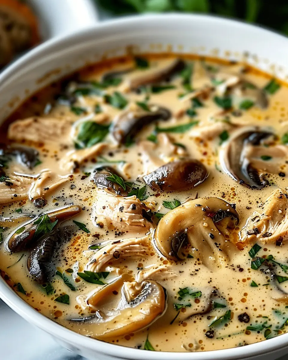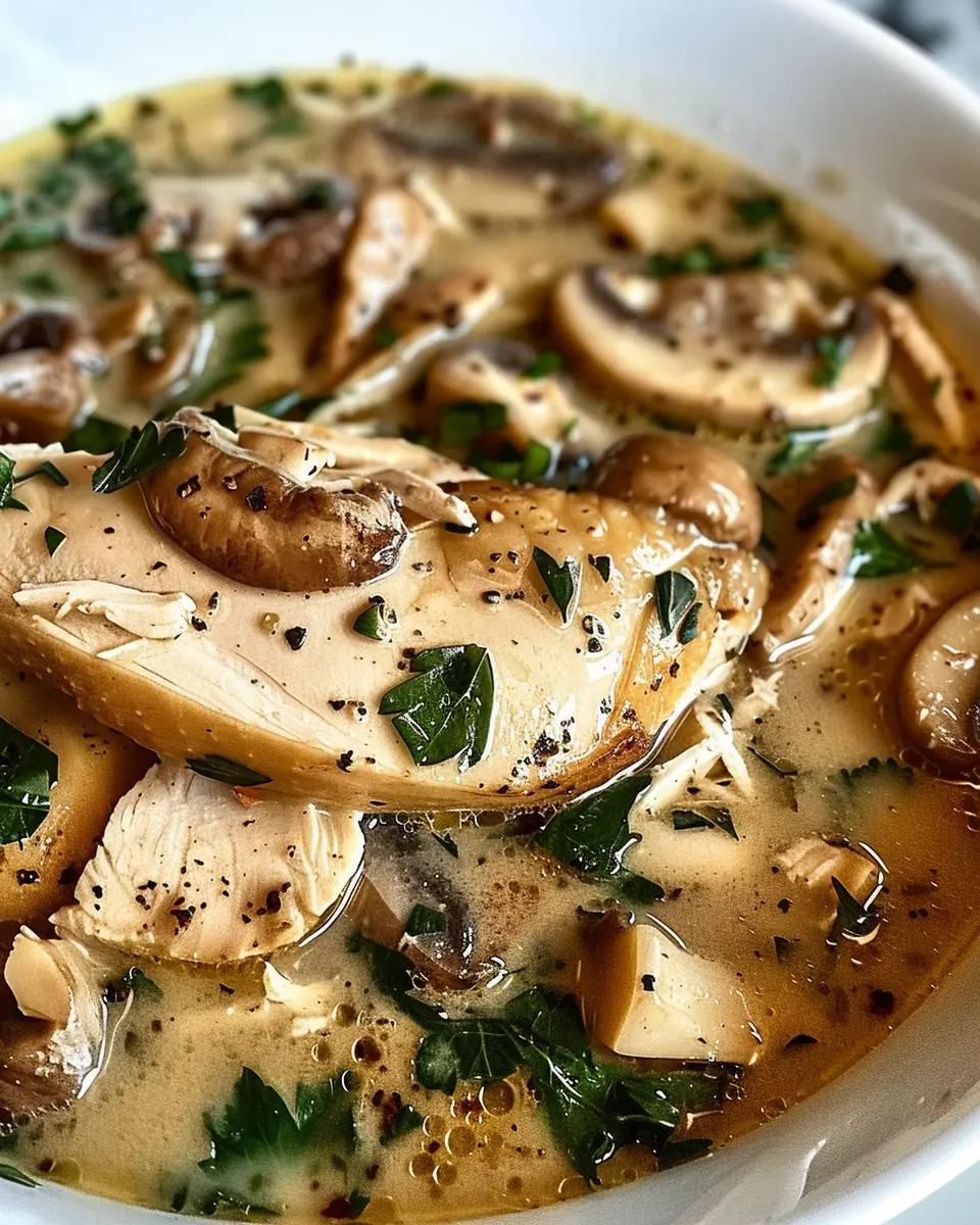 A warm and comforting soup made with rotisserie chicken and mushrooms, perfect for any occasion.