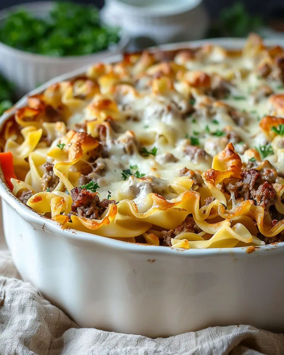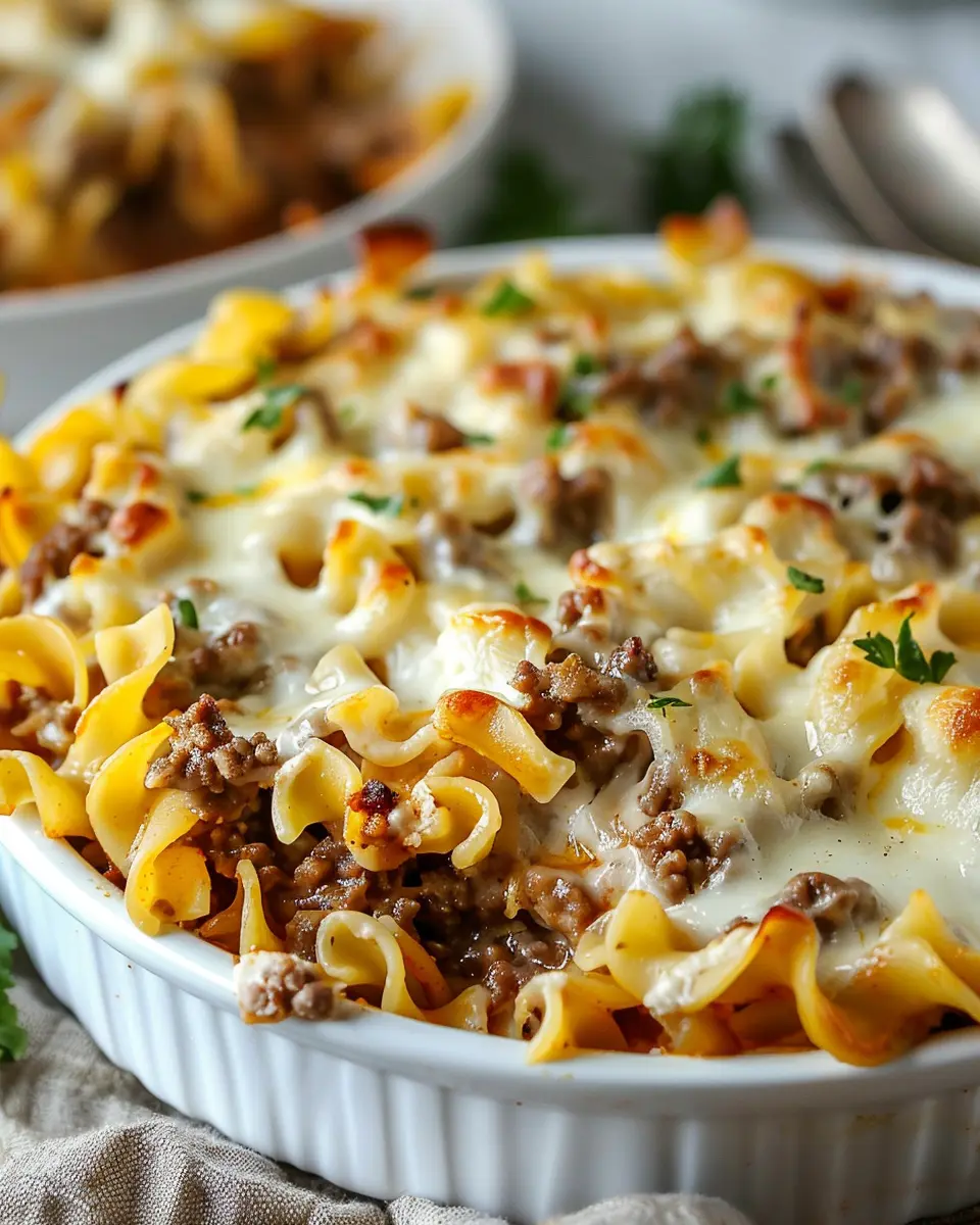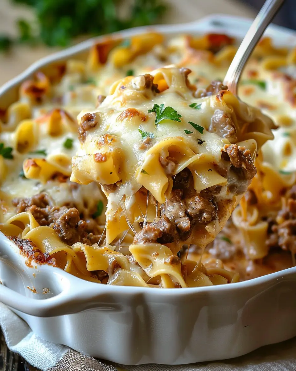 In your prepared baking dish, the fun part begins! First, layer half of the cooked egg noodles on the bottom. Next, spoon half of the beef mixture over the noodles. After that, spread half of the creamy cheese mixture. Repeat the layers—noodles, beef, and cheese—until you’ve used all your ingredients. This creates a beautiful, hearty tower of flavors.